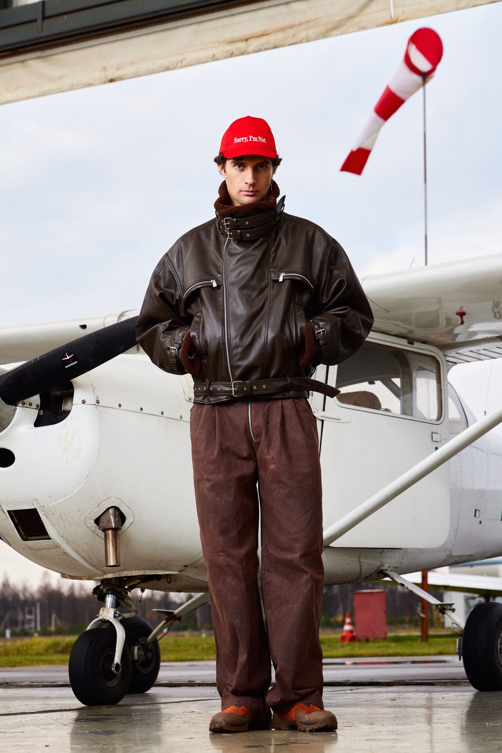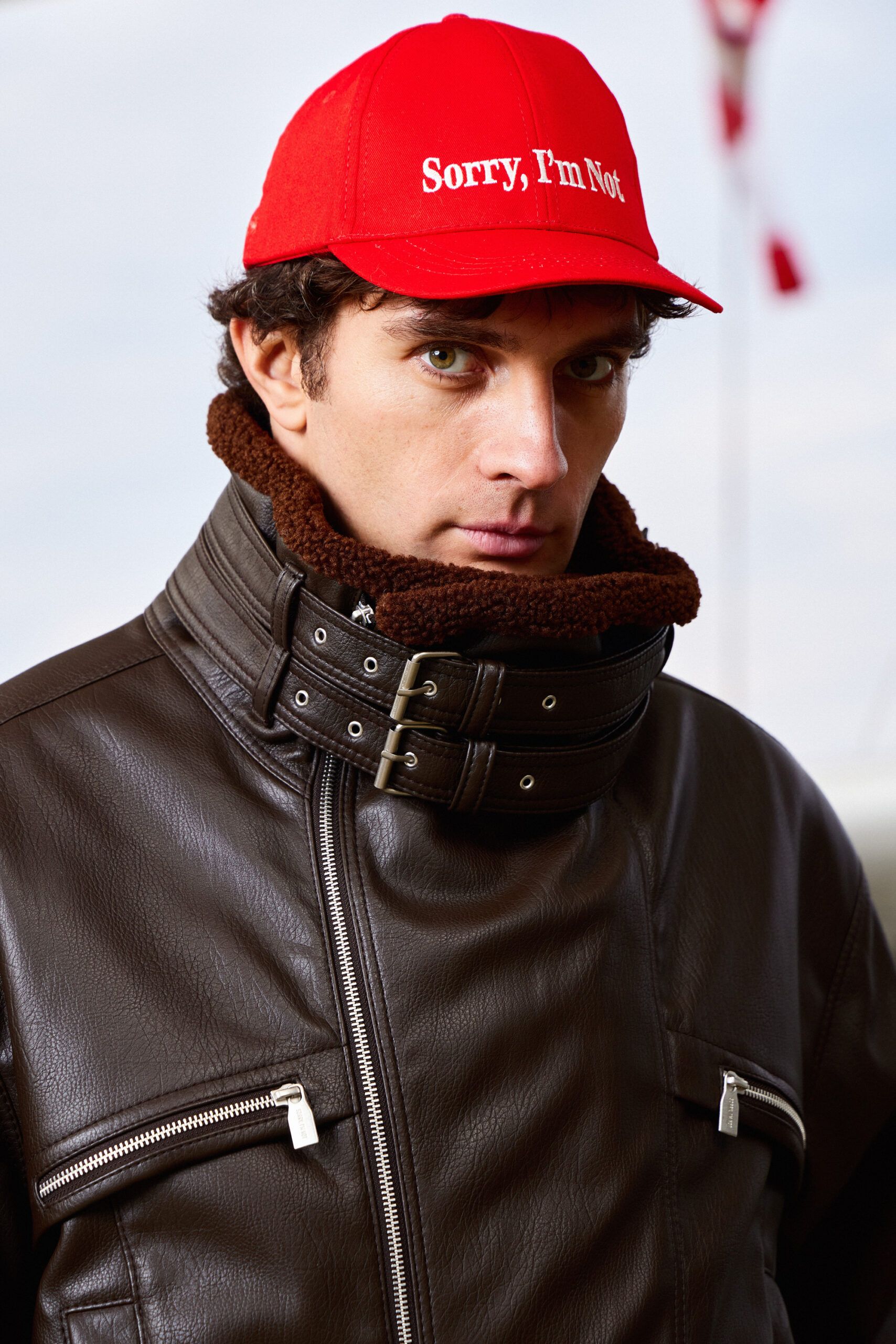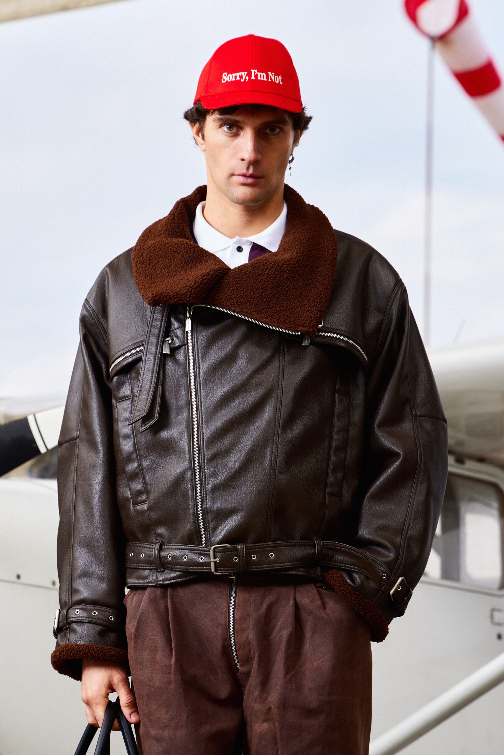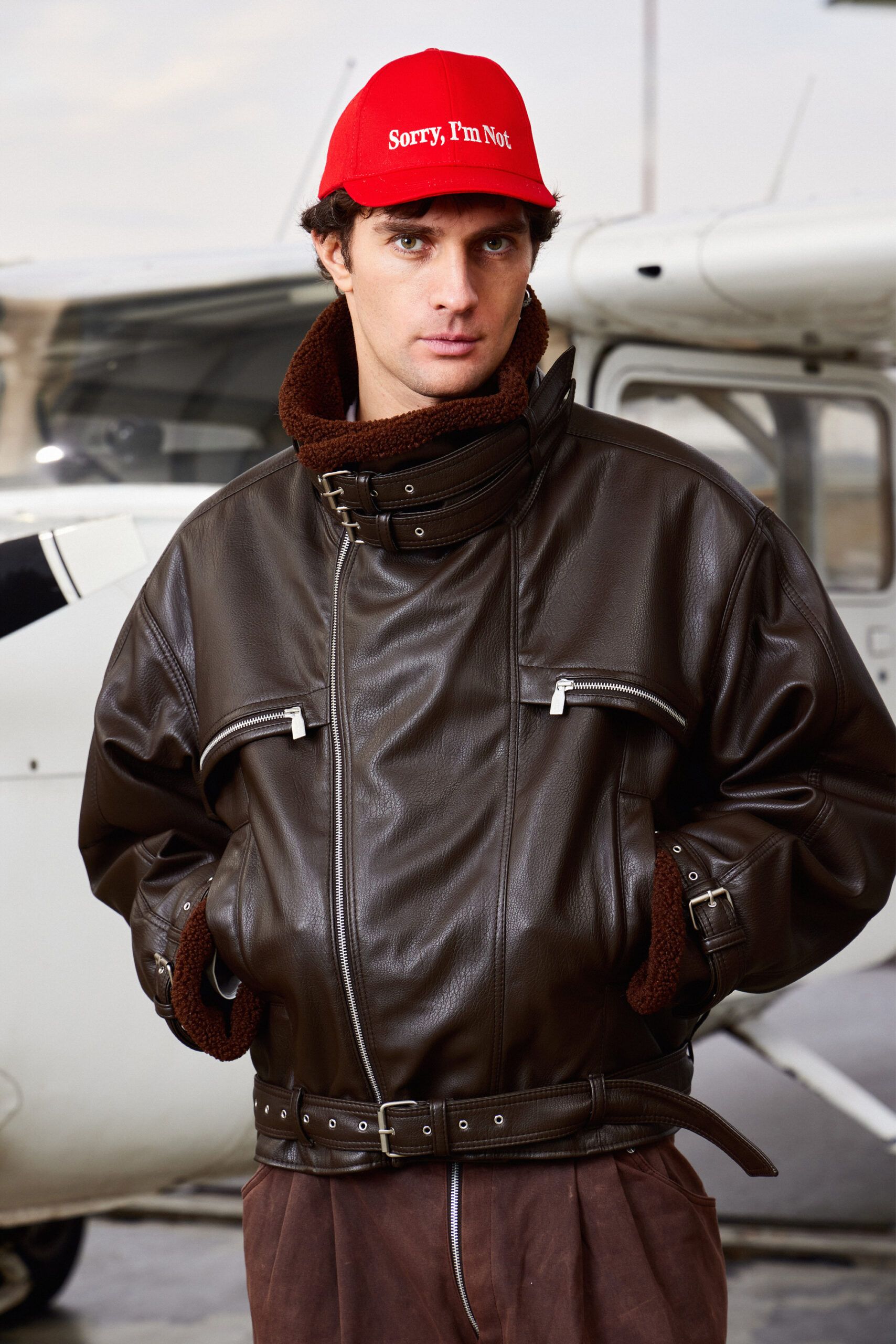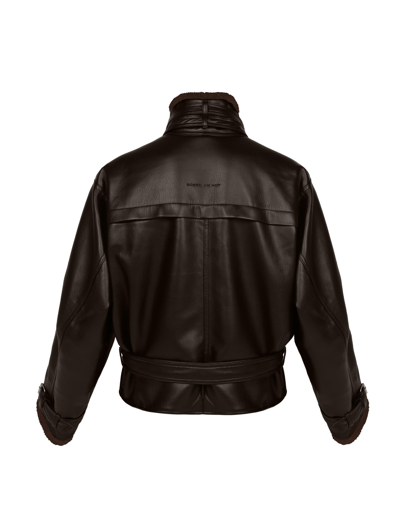 The jacket is made of faux leather in brown with a stand-up collar in sherpa and is complemented by accent belts at the neck, sleeves and waist. The belt can be moved to higher loops for a more vintage fit.