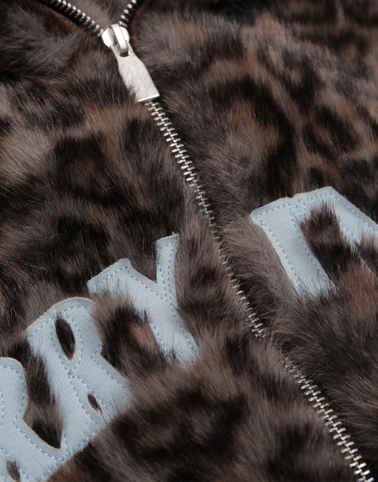 A leopard print fur coat with an accent logo on the front of the product.