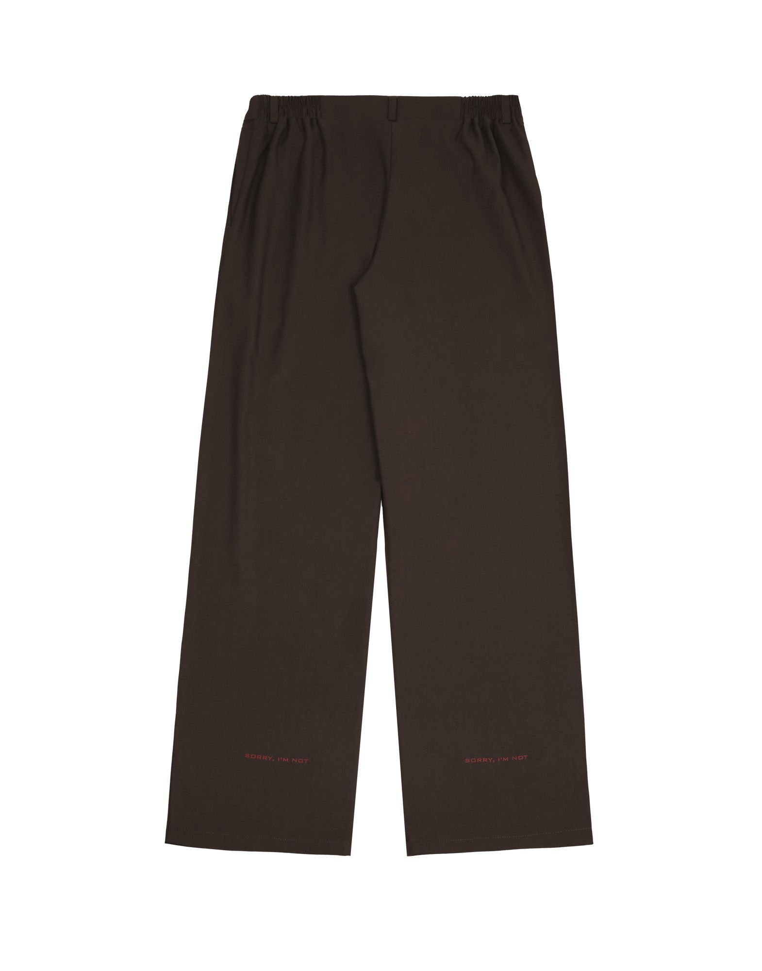 Брюки MAISON в коричневом оттенке, сзади низ штанин дополнен логотипом бренда.