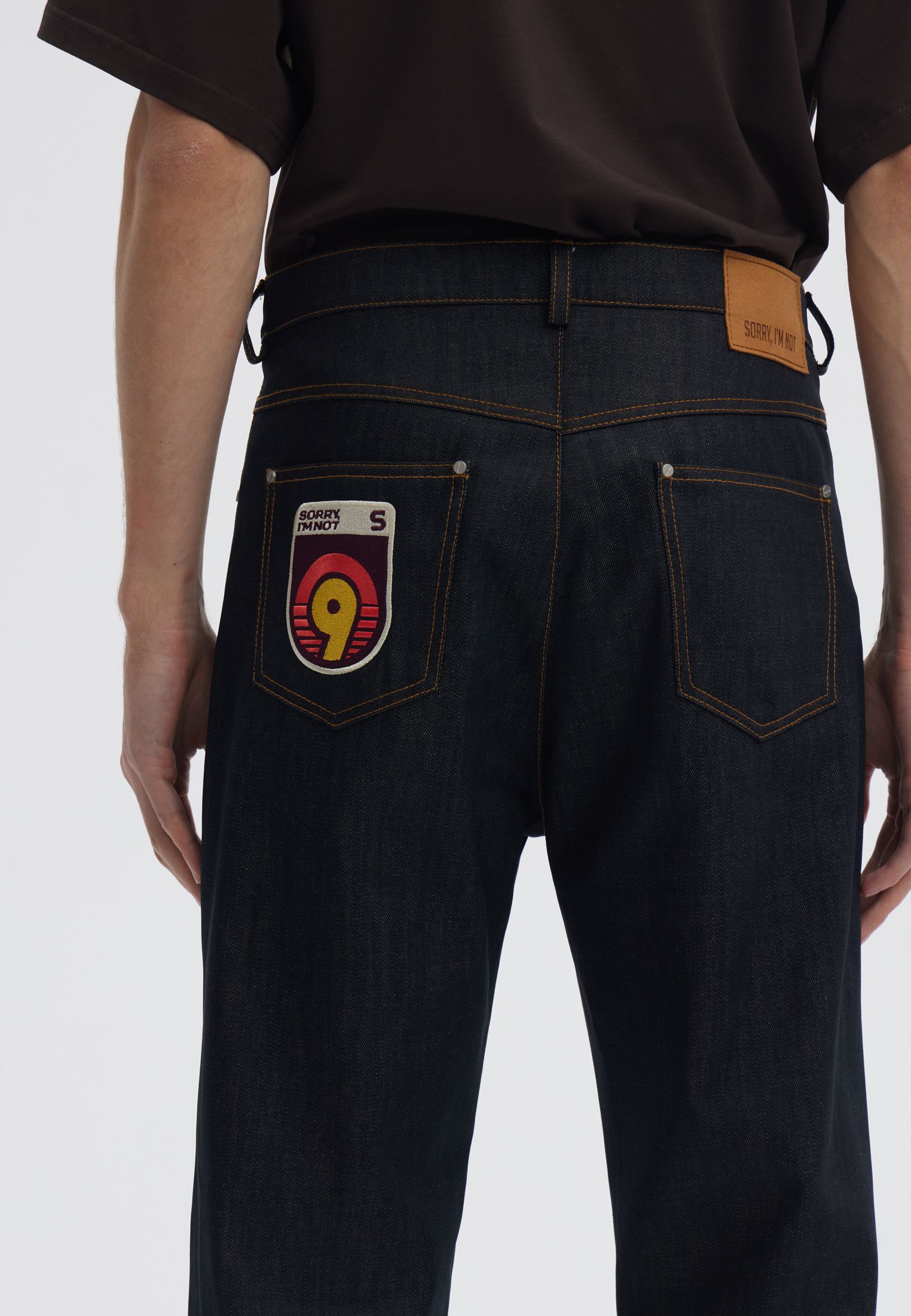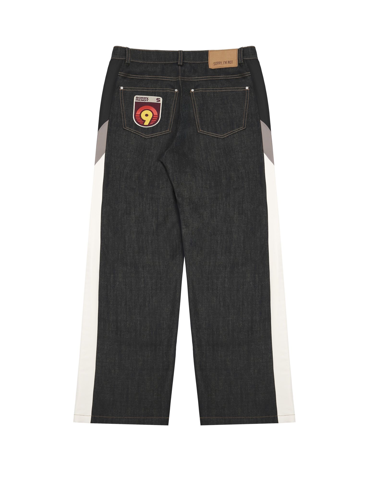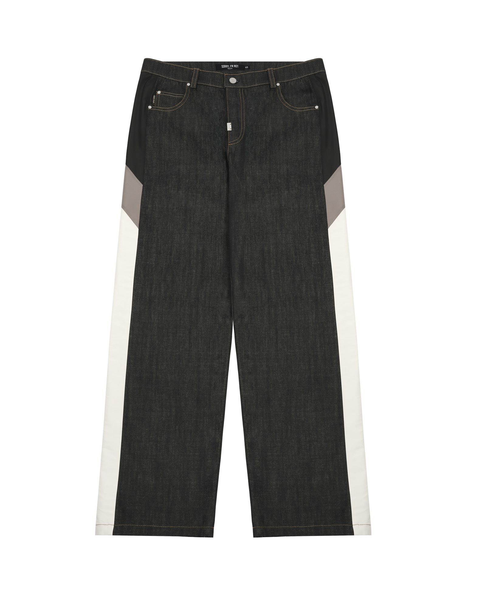 Чёрные джинсы с бело-серыми лампасами по бокам. На заднем кармане нашивка с логотипом SORRY, I’M NOT.