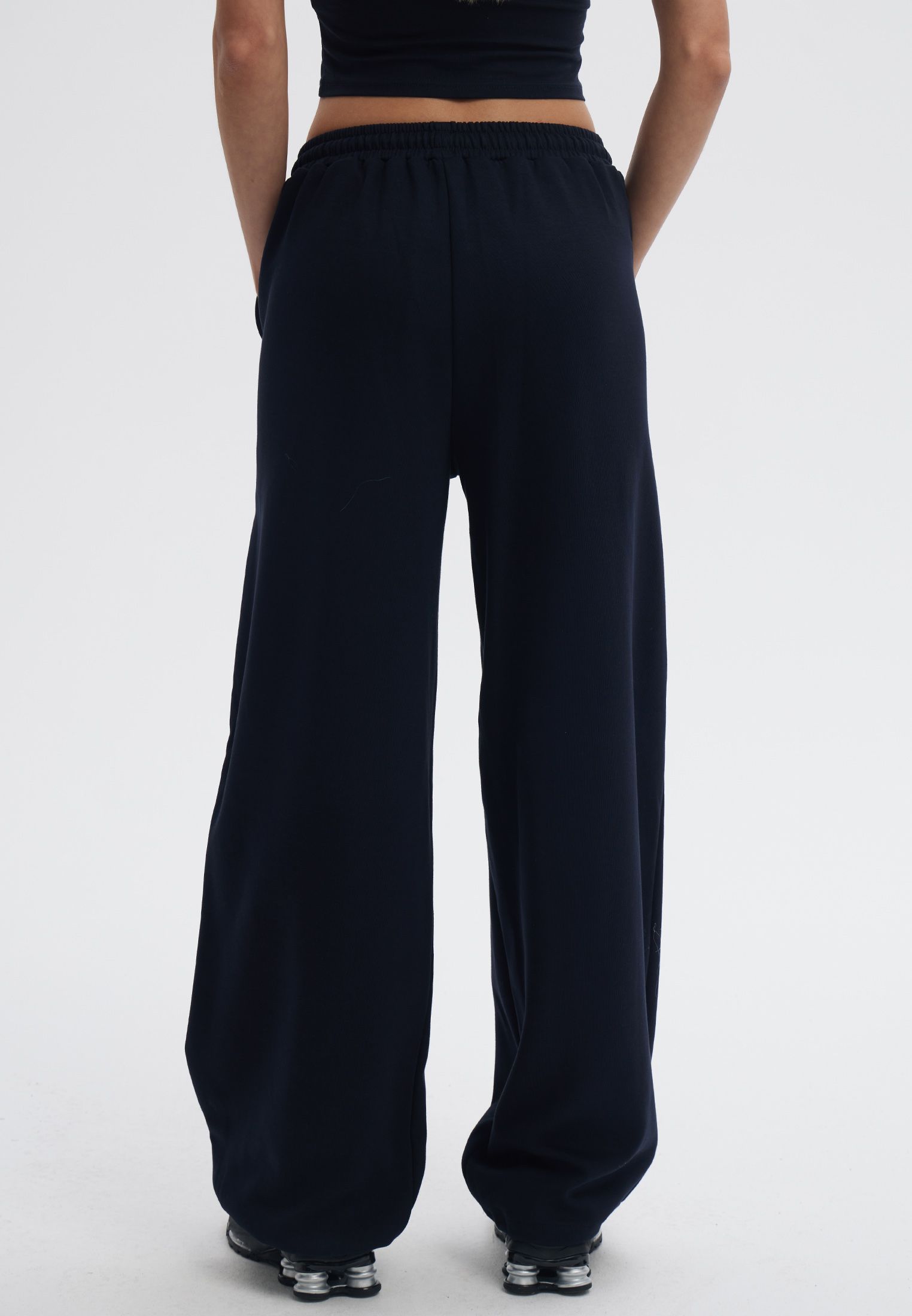 Темно — синие джоггеры с желтым графичным логотипом сбоку.