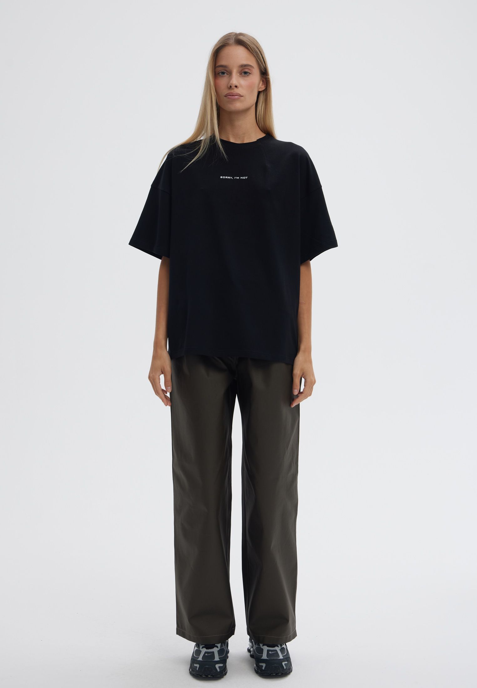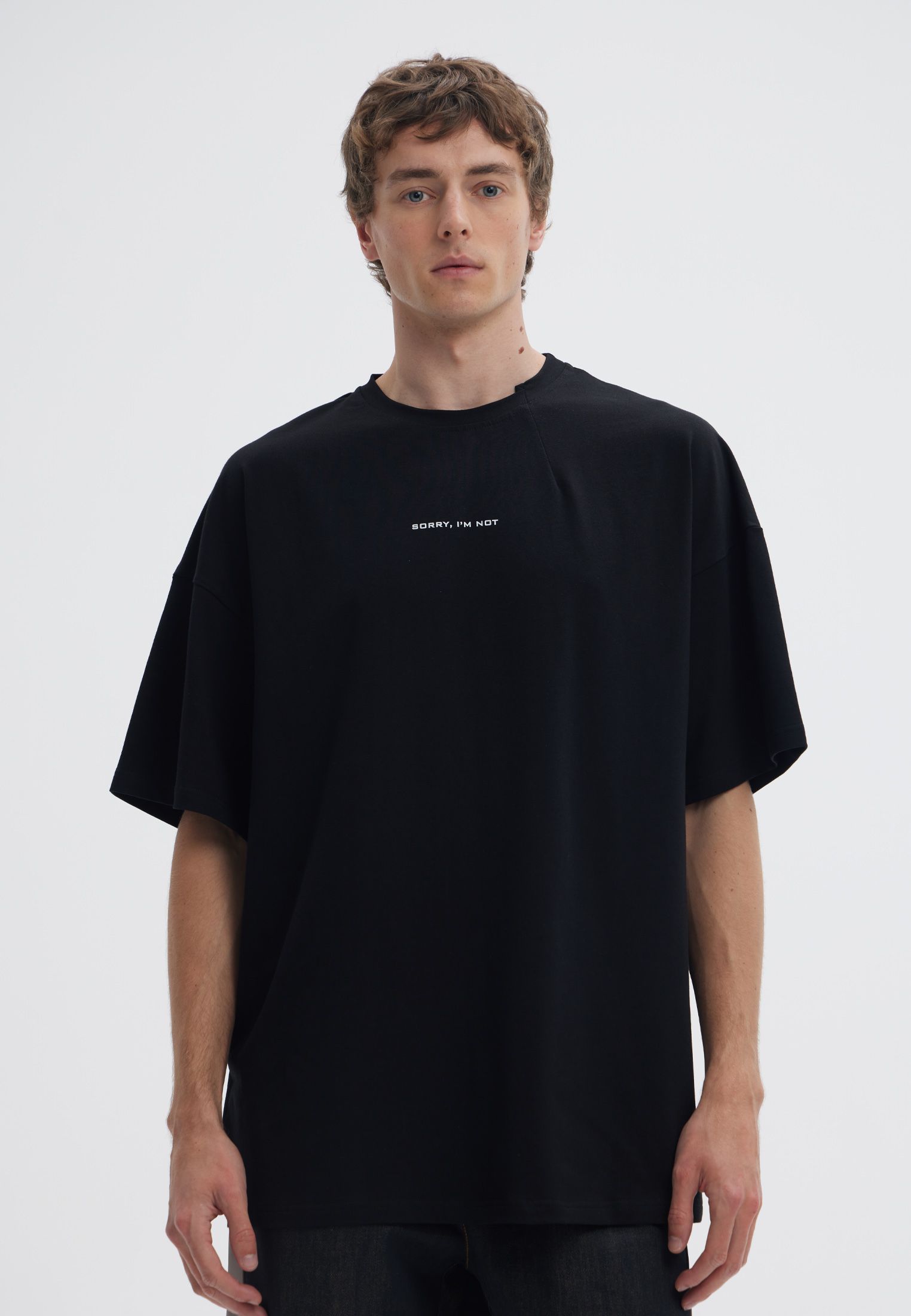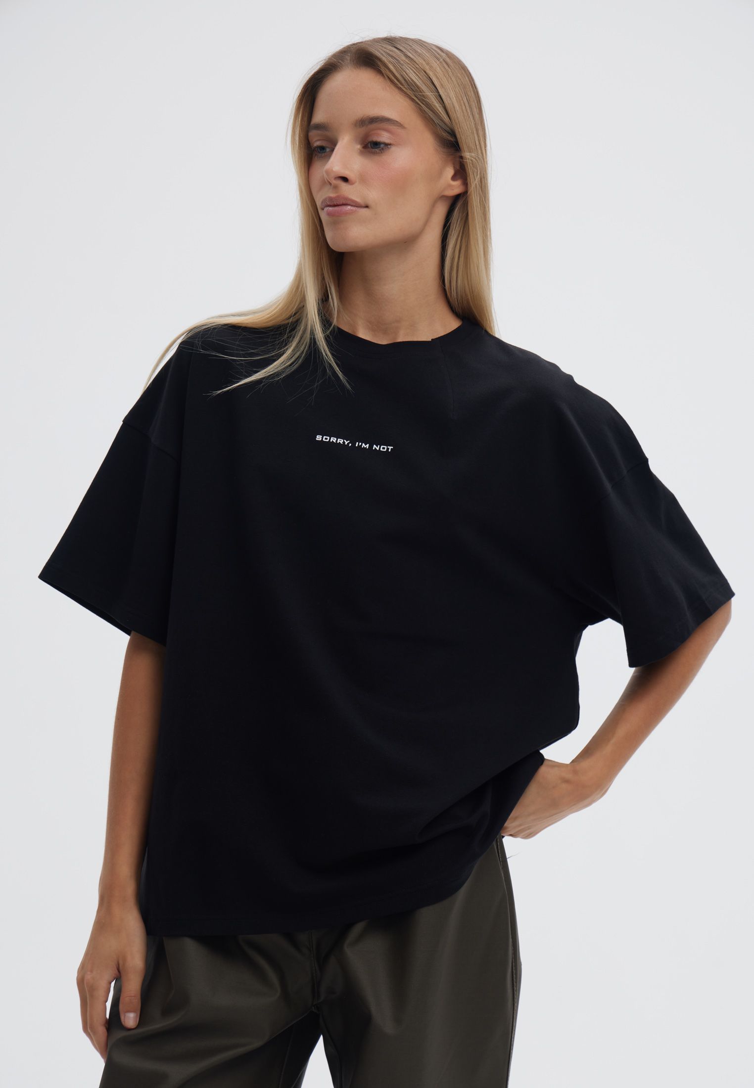Футболка oversize черного цвета из мягкого хлопка с защипом на шее и логотипом SORRY, I’M NOT на груди