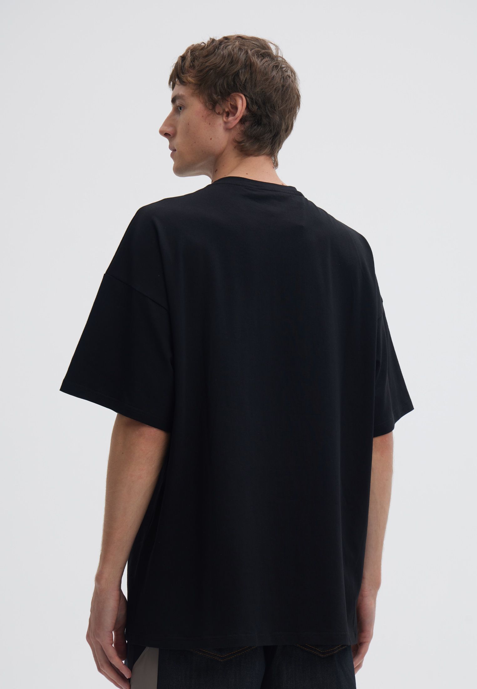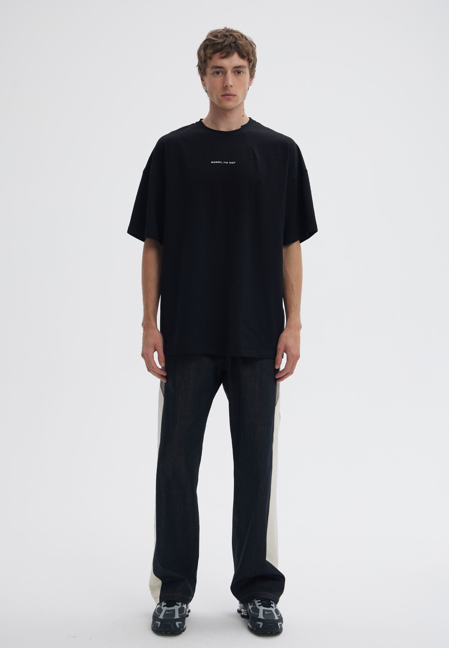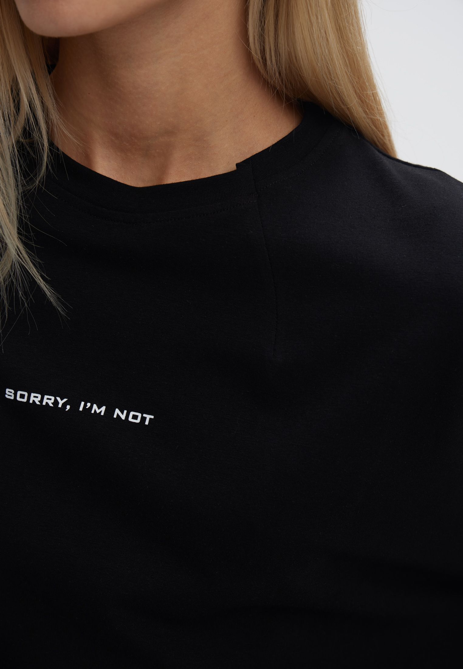 Футболка oversize черного цвета из мягкого хлопка с защипом на шее и логотипом SORRY, I’M NOT на груди