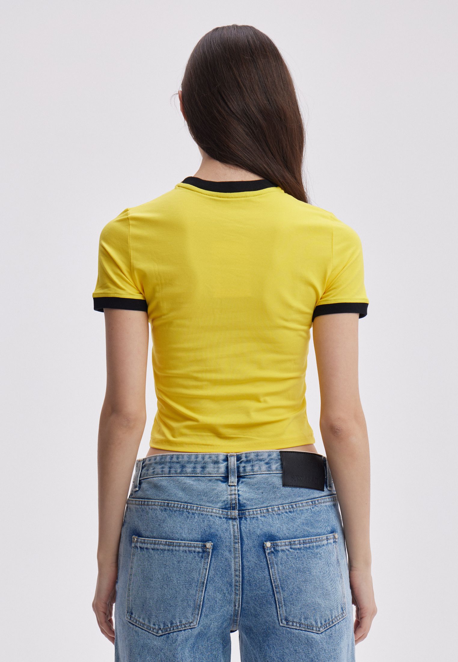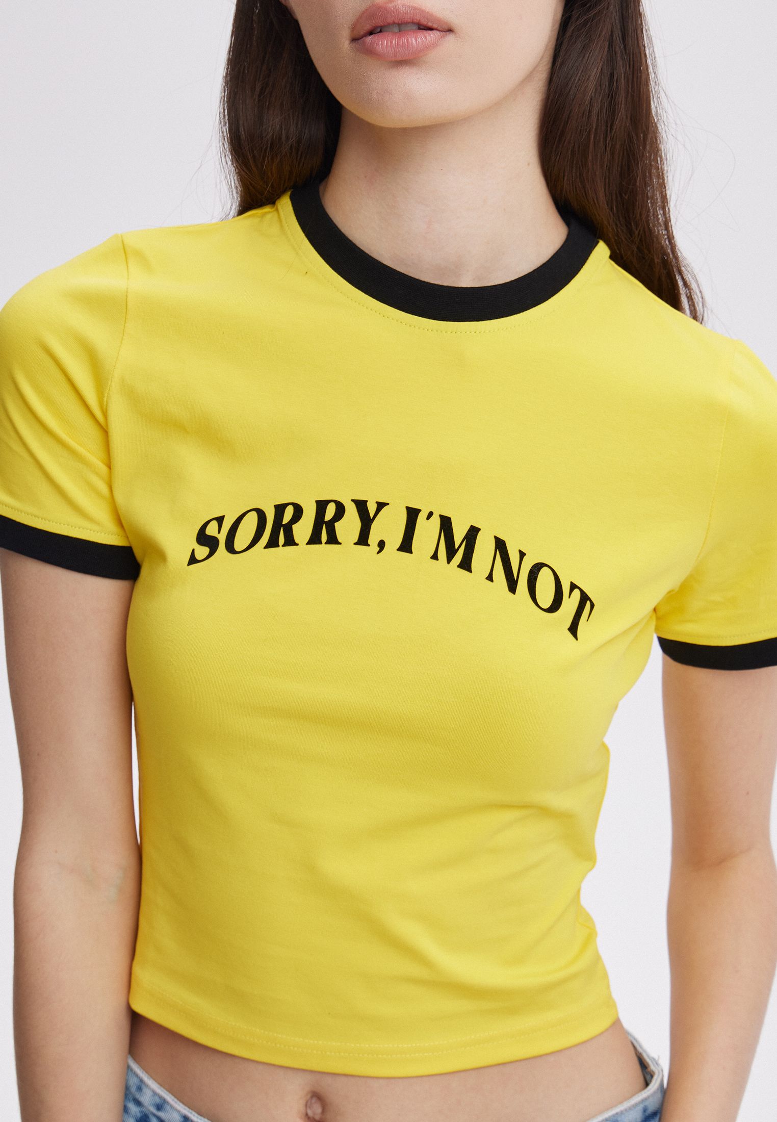 Желтая футболка с черным логотипом SORRY, I’M NOT. Логотип с peach эффектом. Посадка женская.