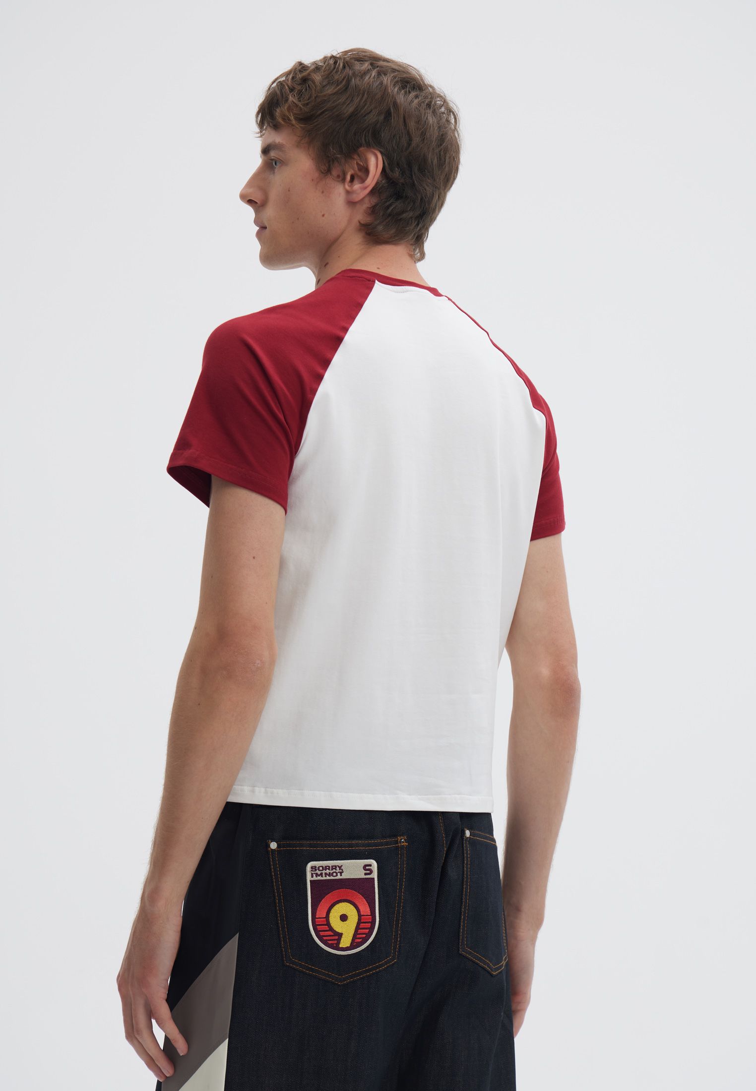 Футболка мужского кроя, в молочном цвете, с бордовыми рукавами. Дополнена авторским принтом. Рекомендуется только химчистка.