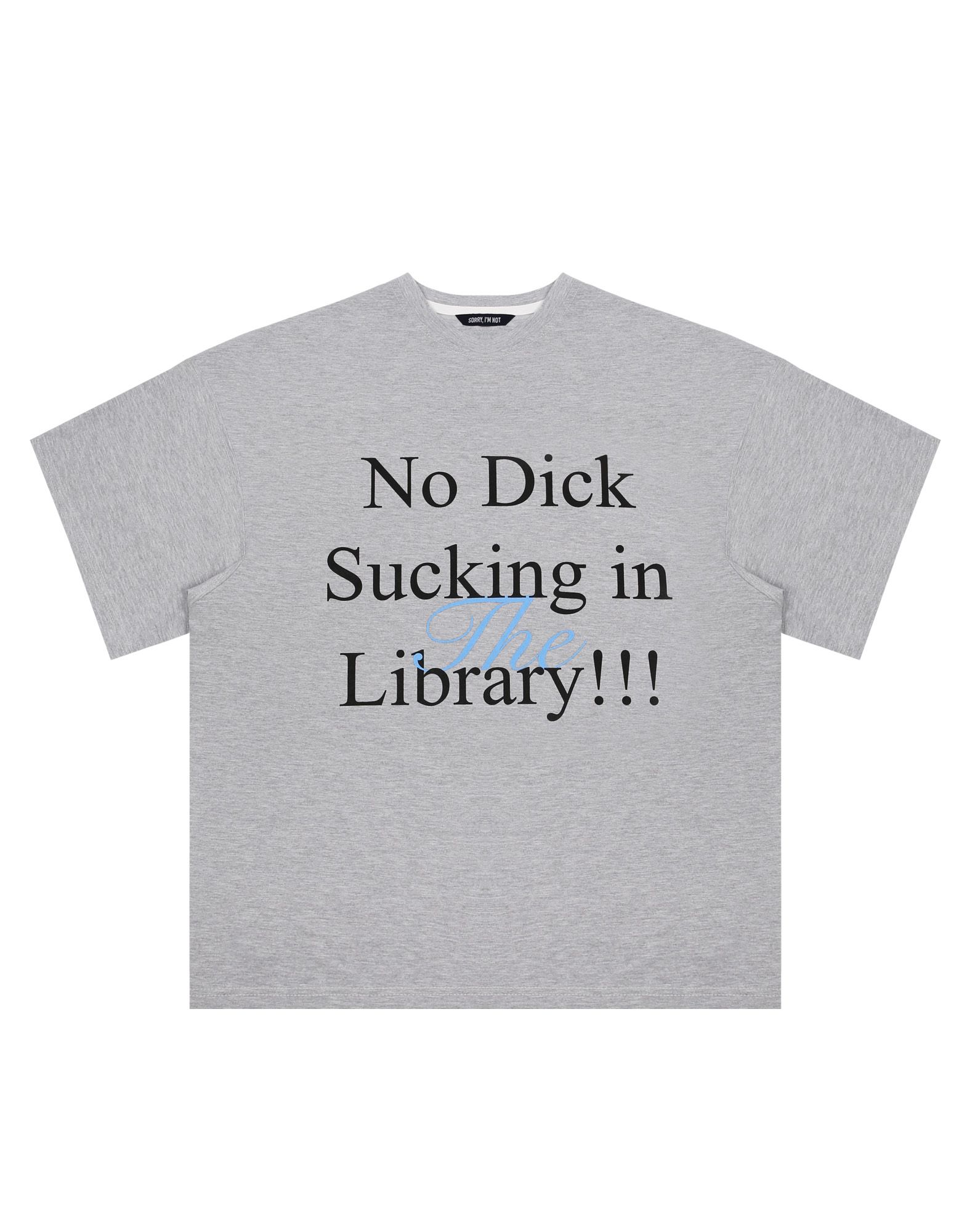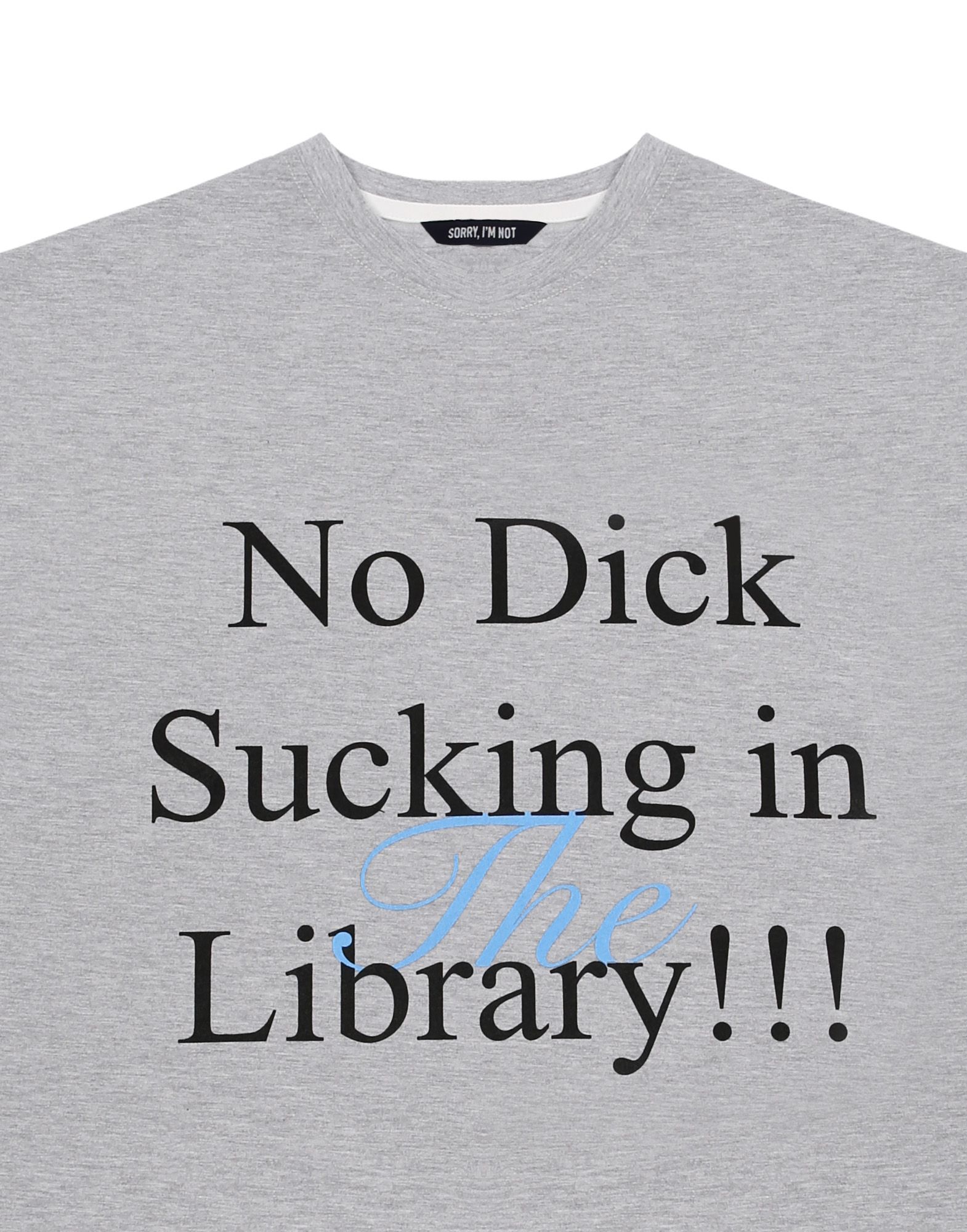 Футболка цвета серый меланж из плотного хлопка, дополненный авторским принтом «NO DICK SUCKING IN THE LIBRARY».