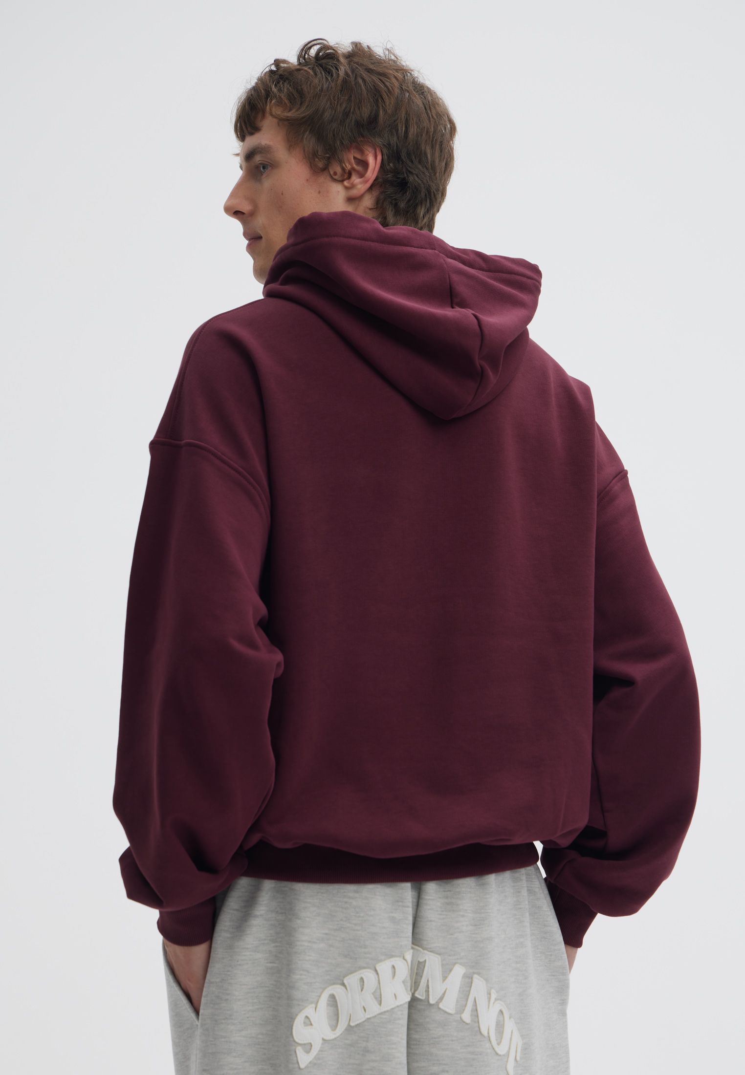 Бордовое худи с авторским принтом. Выполнен из 100% хлопка, свободный крой.