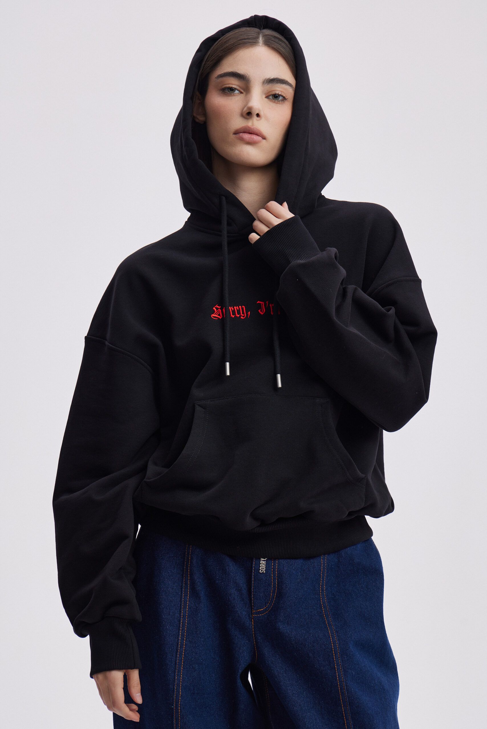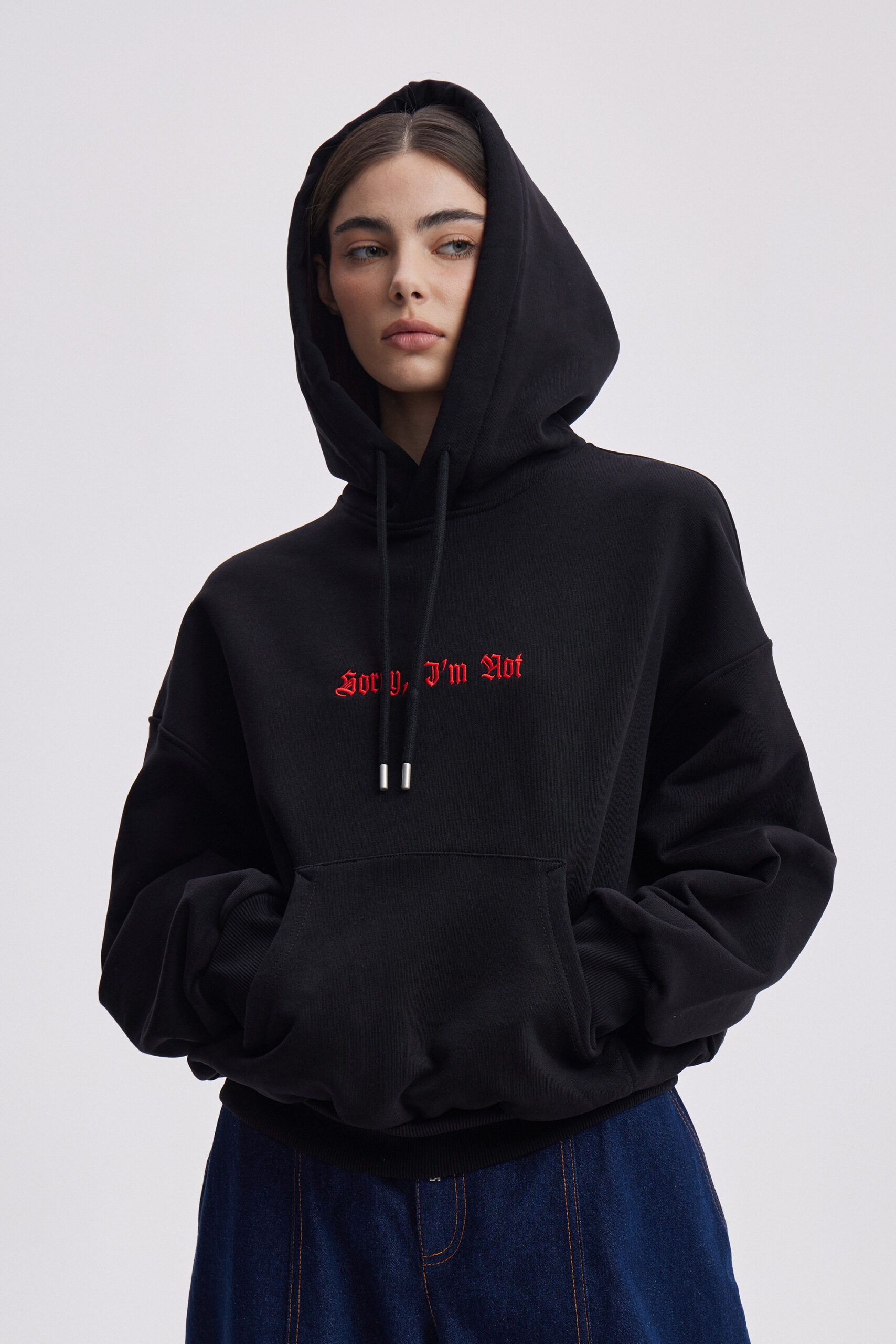 Черное худи с вышитым красным логотипом SORRY, I’M NOT™ в готическом стиле. Подходит как парням, так и девушкам.
