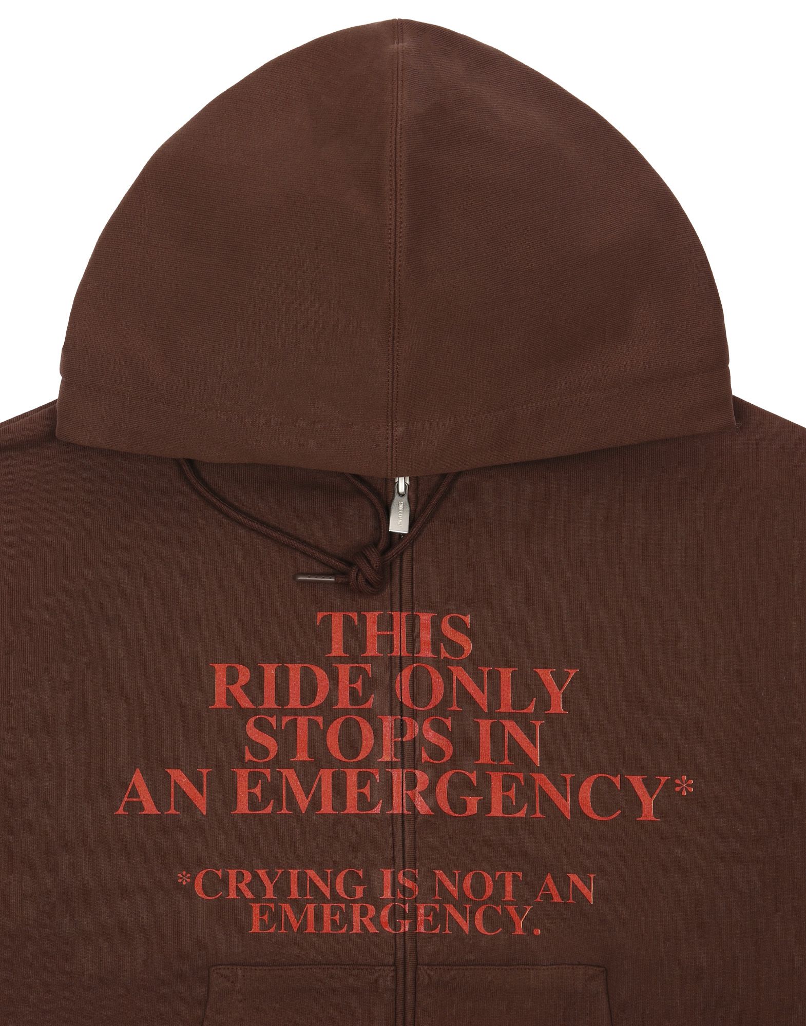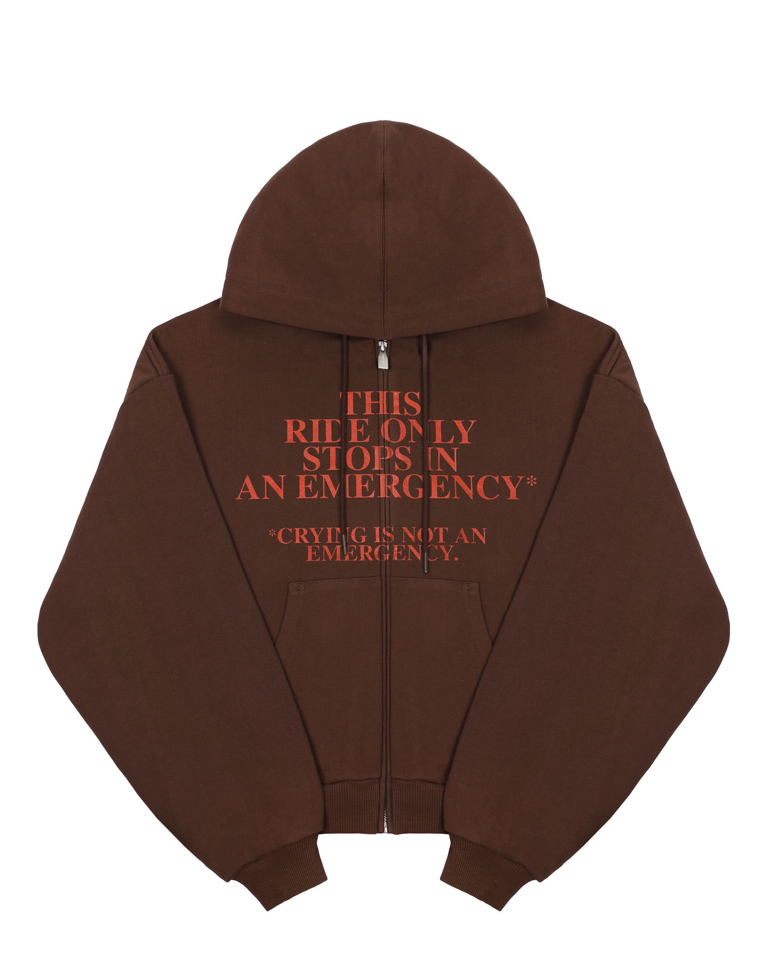 Худи зип EMERGENCY в коричневом цвете с авторским принтом.
