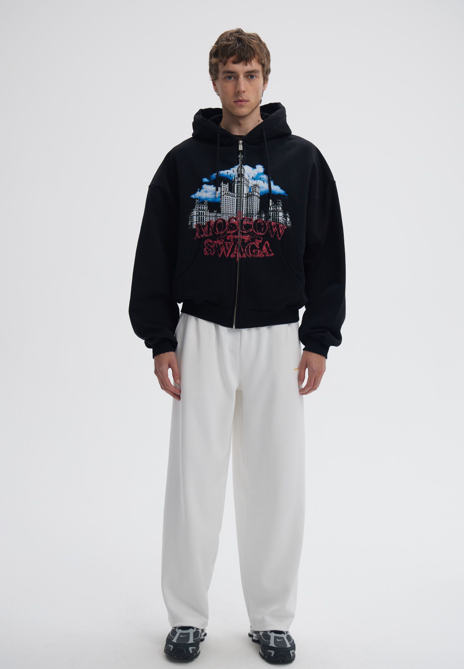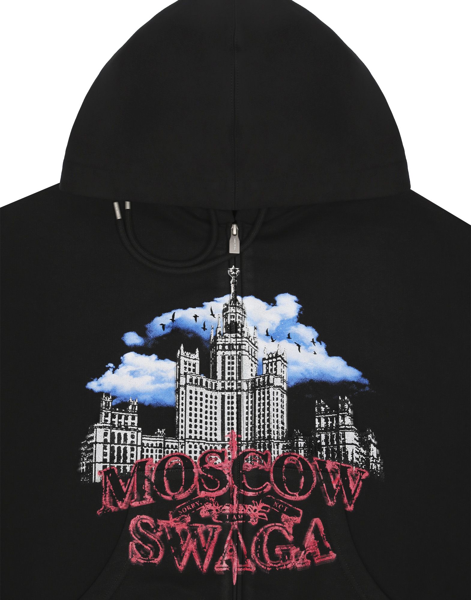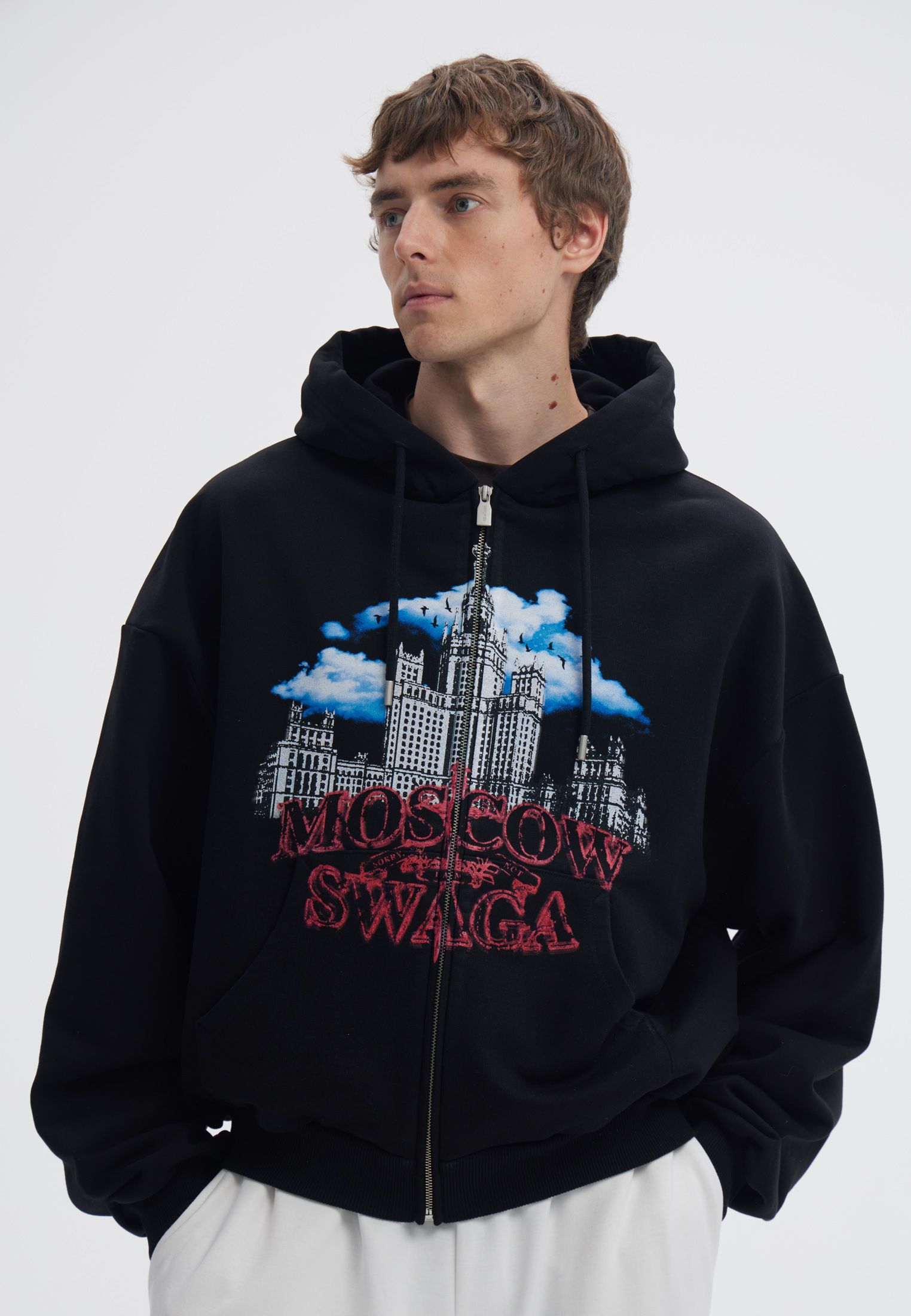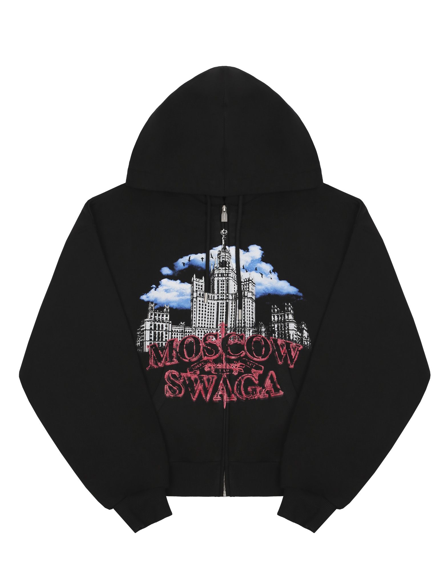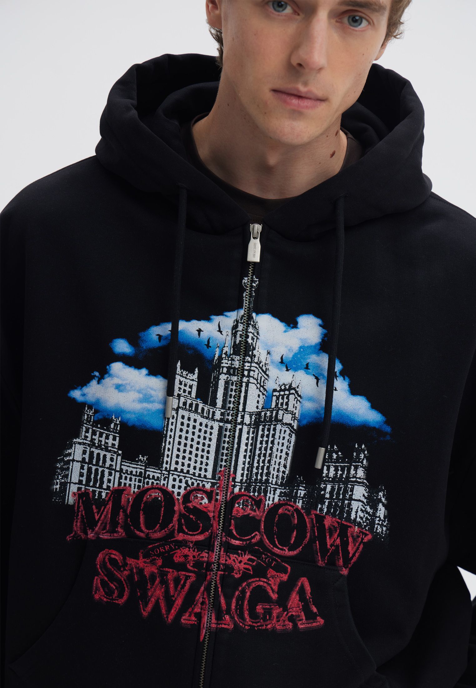 Худи зип MOSCOW SWAGA в черном цвете с авторским принтом