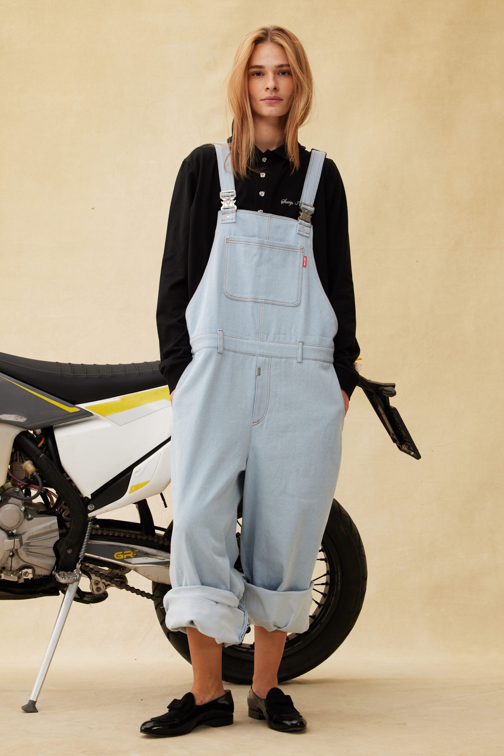 Джинсовый комбинезон в голубом цвете. Карман спереди дополнен вышитым лого. Подойдет как для парней, так и для девушек.
