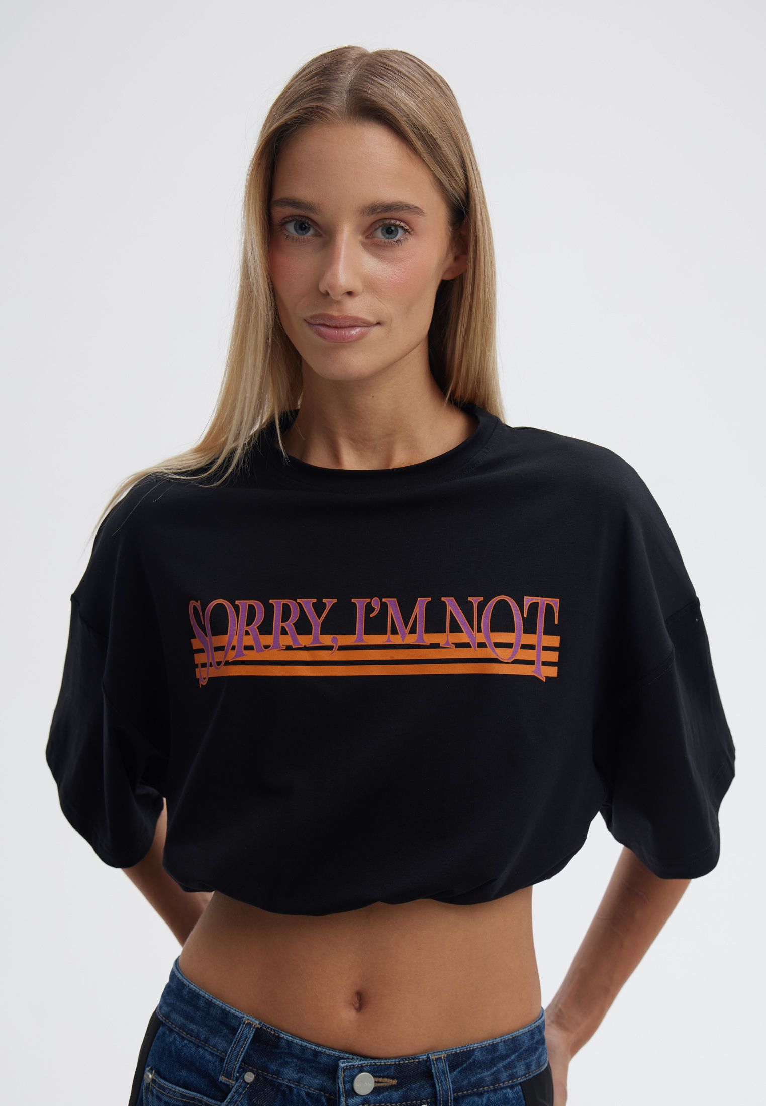 Свободный укороченный женский топ черного цвета из легкой хлопковой ткани. Низ топа дополнен резинкой, обеспечивающей плотное прилегание к телу. Спереди на груди расположен авторский принт. Короткие рукава как у футболки, спущенная линия плеч.