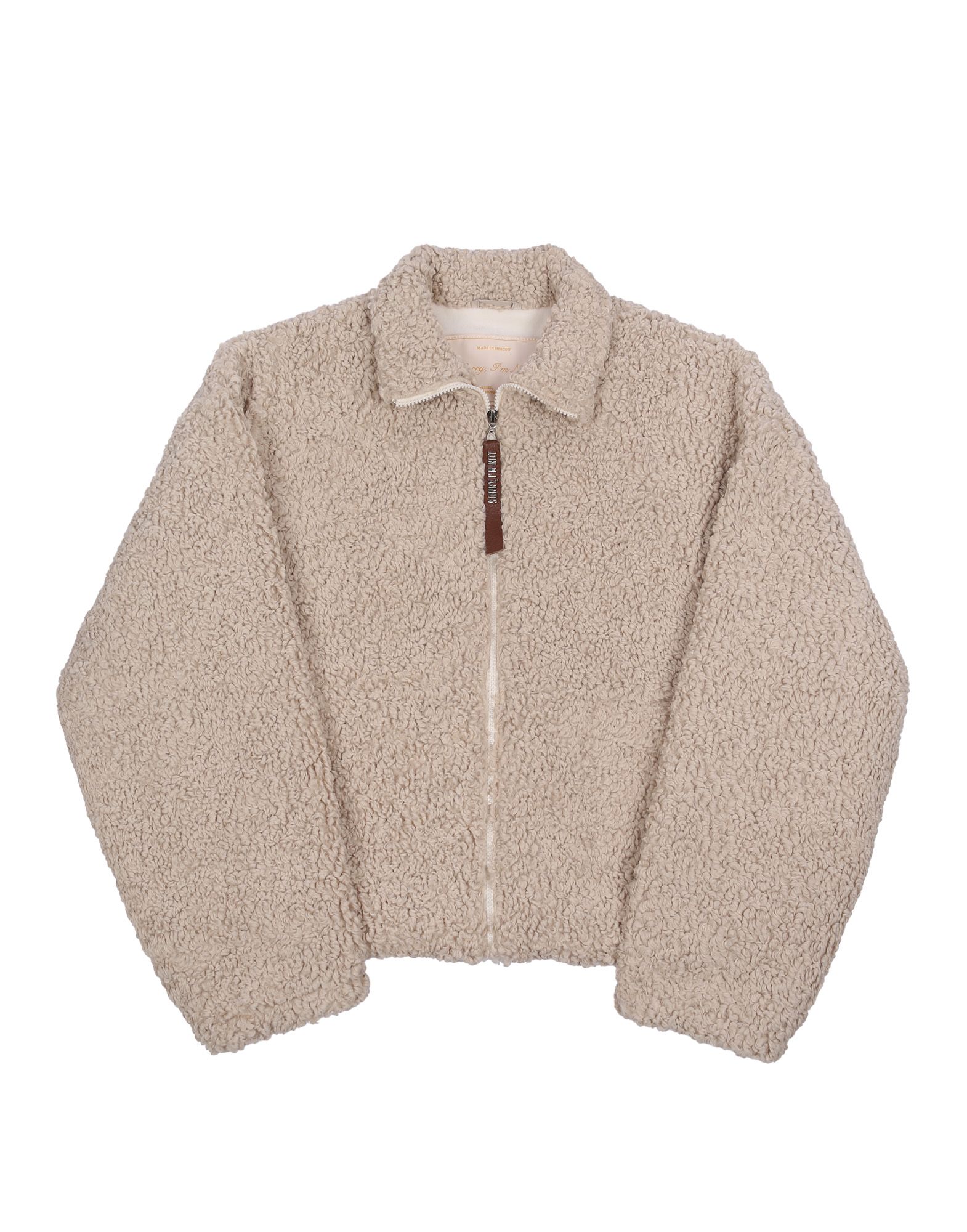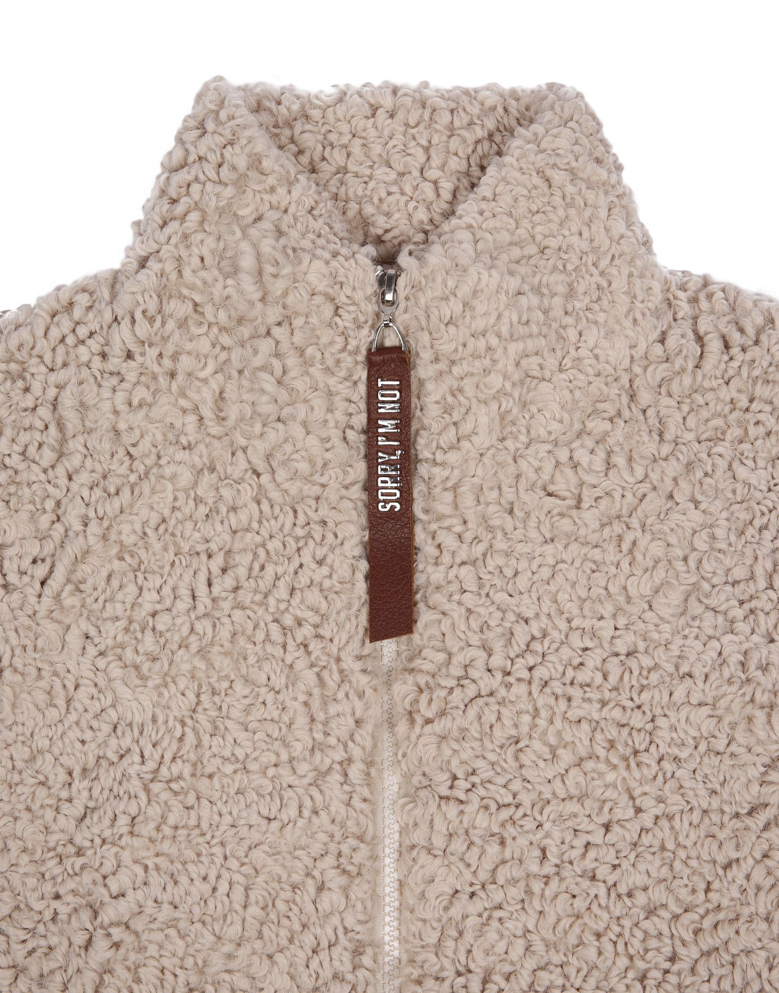 Теплая олимпийка из искуственной овчины в бежевом цвете с брендированной фурнитурой.