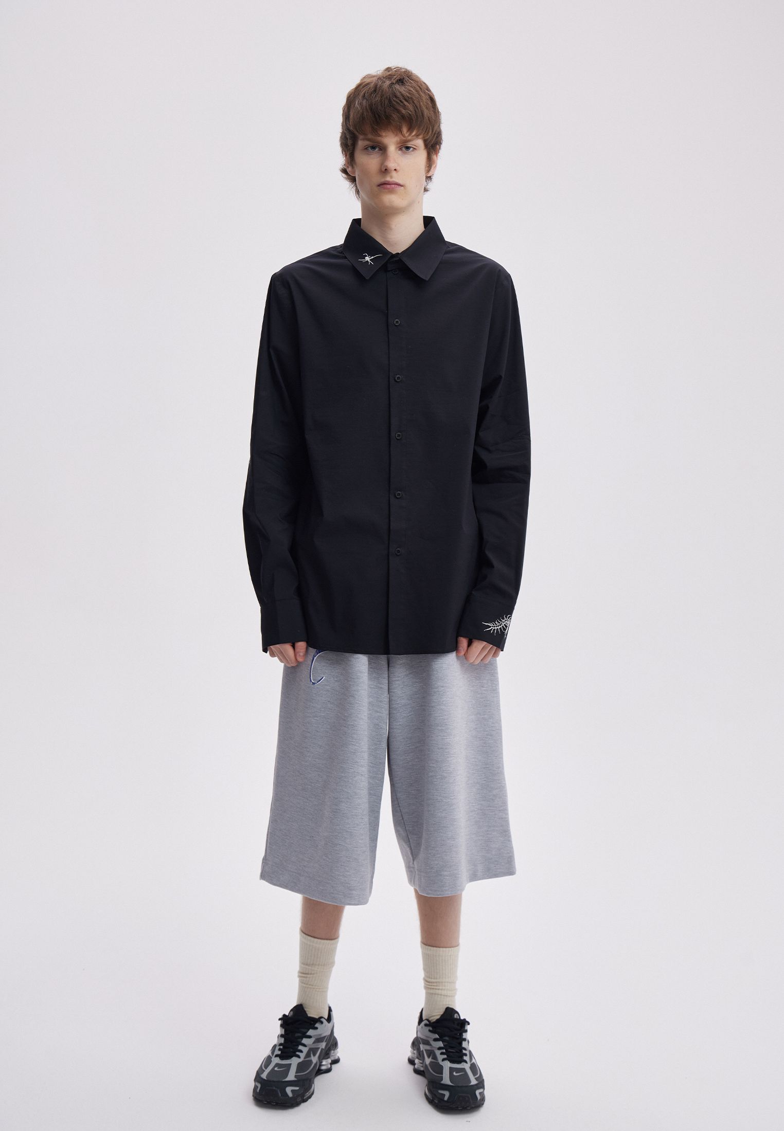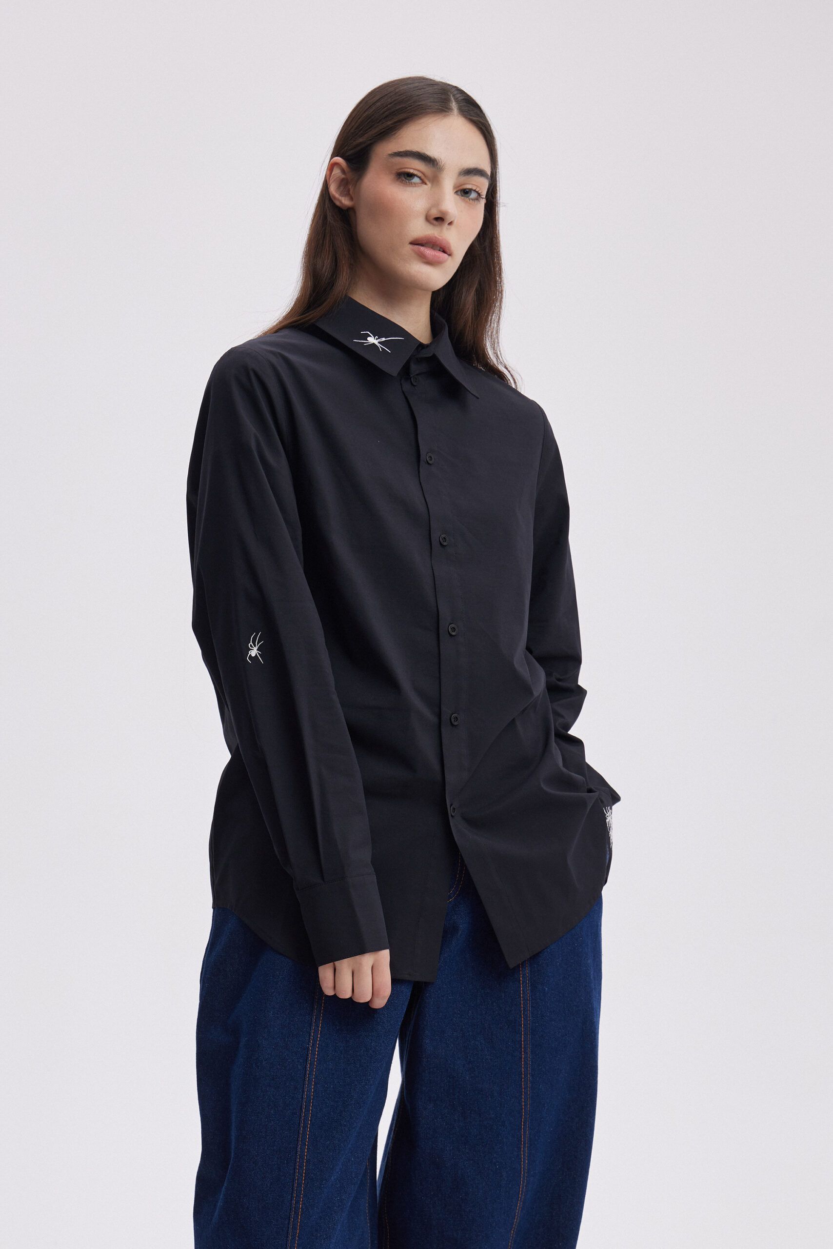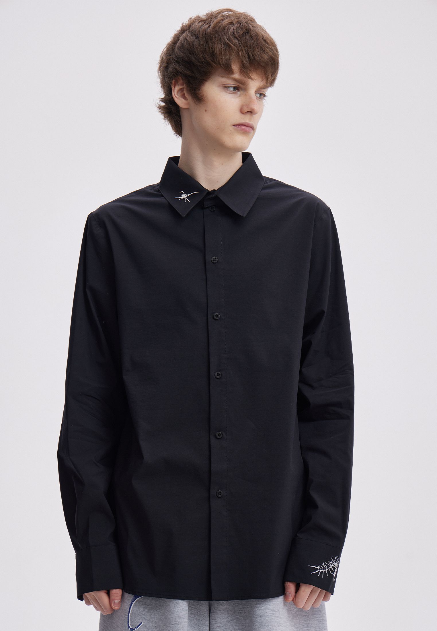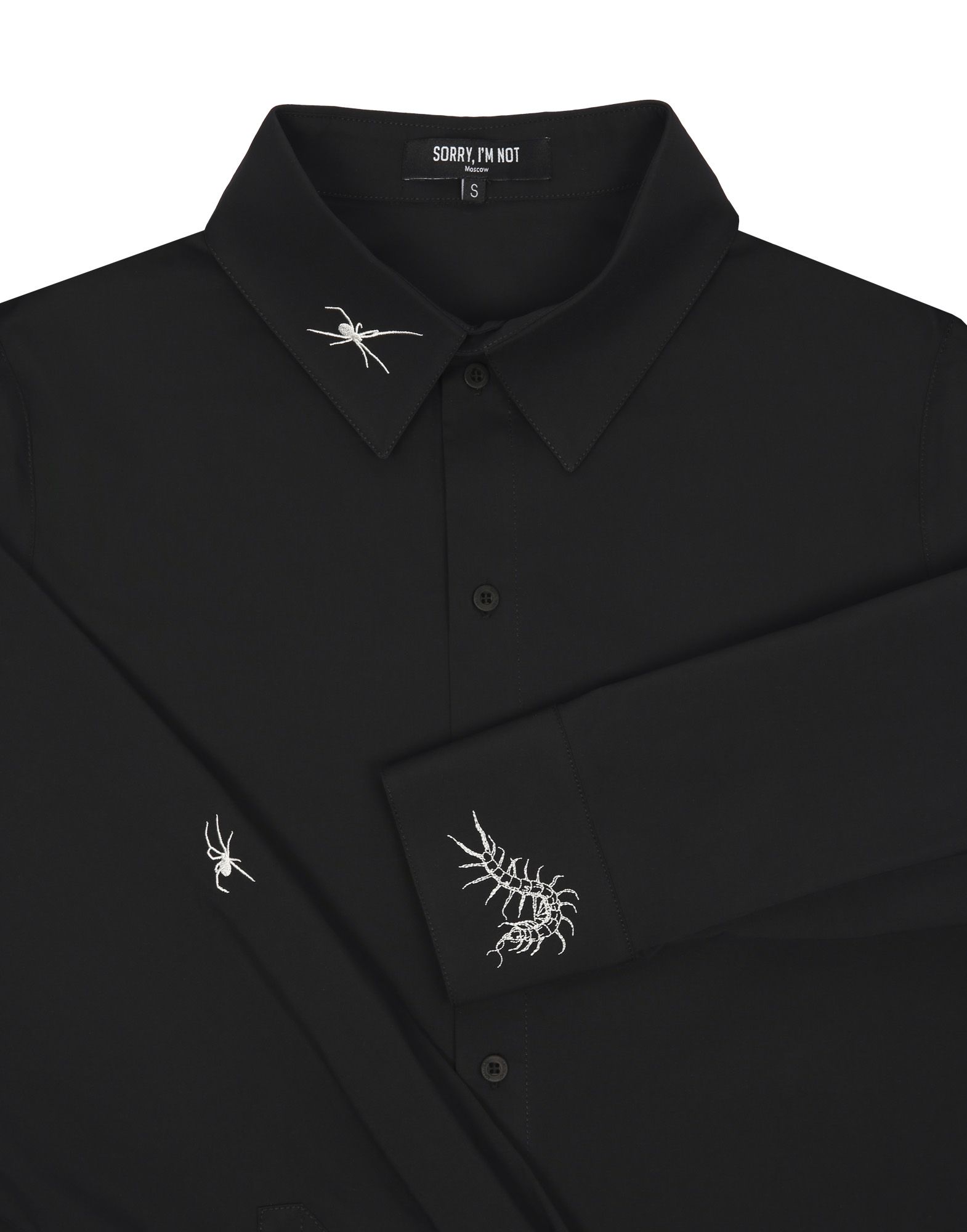 Черная рубашка оверсайз кроя, с вышивками сколопендры и пауков