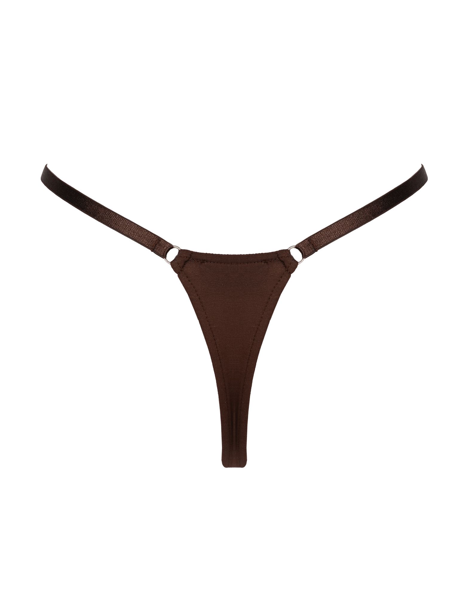Коричневые хлопковые стринги с коричневым регулируемым поясом-резинкой. Спереди на поясе расположен логотип бренда, выложенный стразами, которые крепко термически припаяны. Стринги на высокой посадке, благодаря чему резинку можно натягивать на талию из-под пояса штанов.