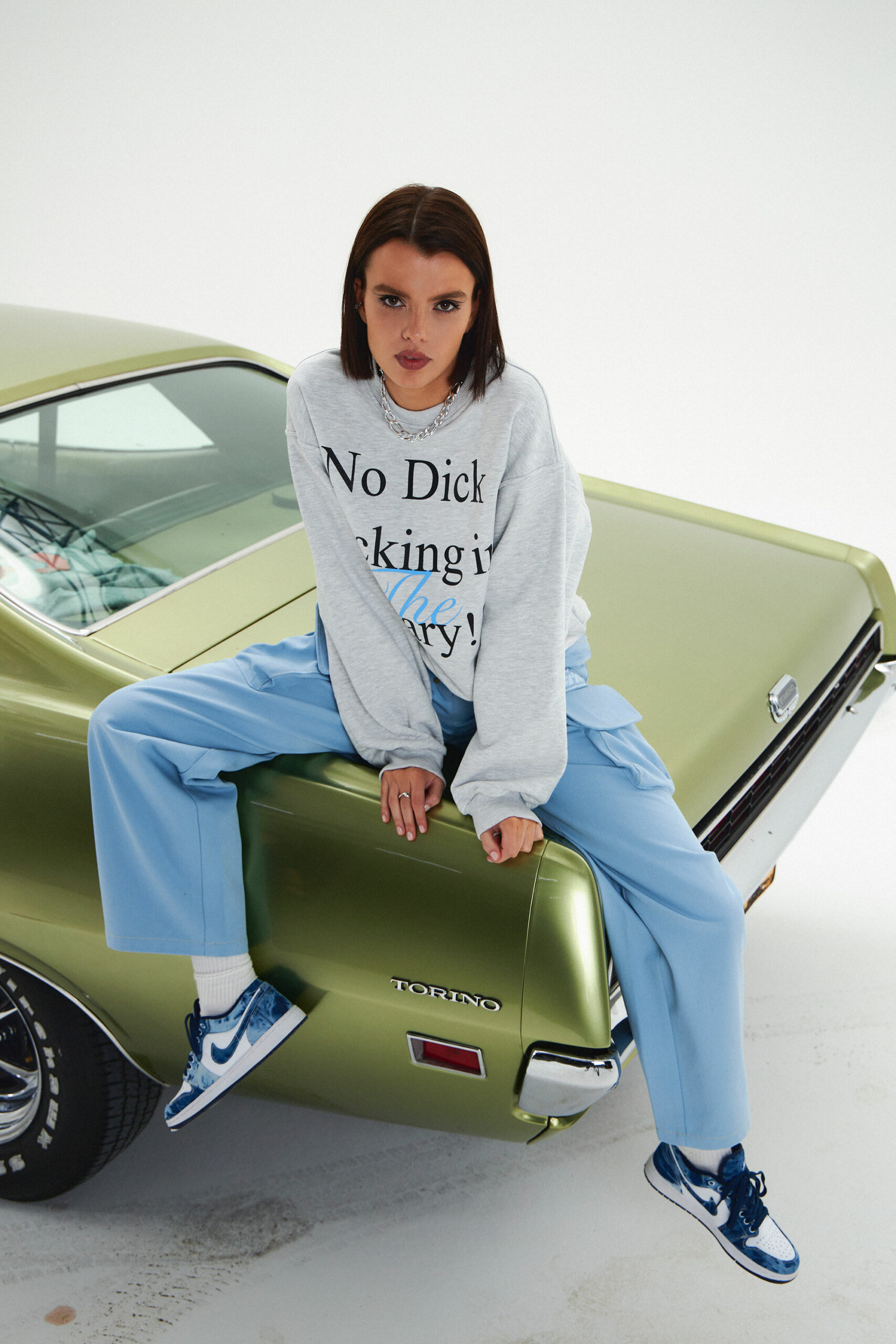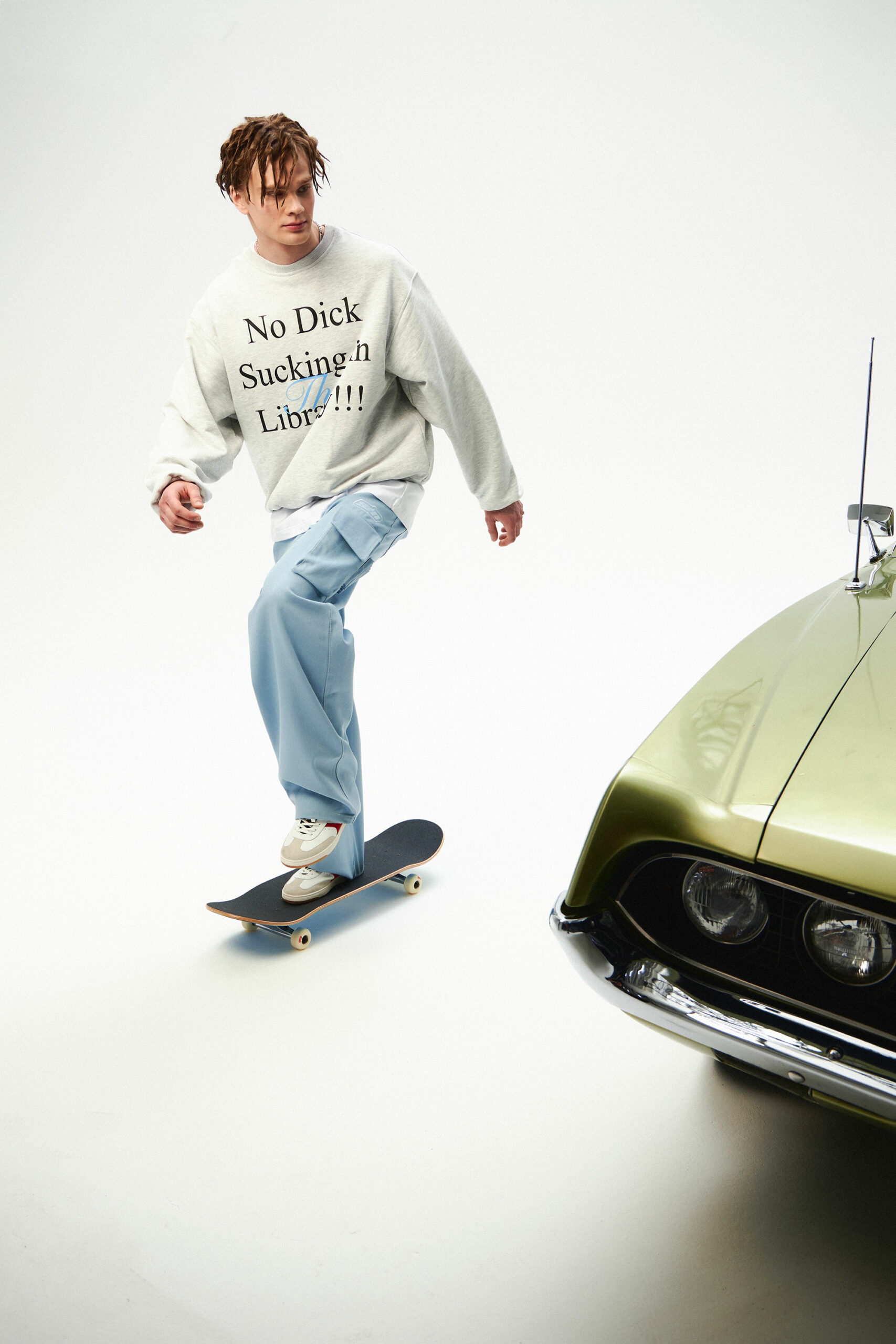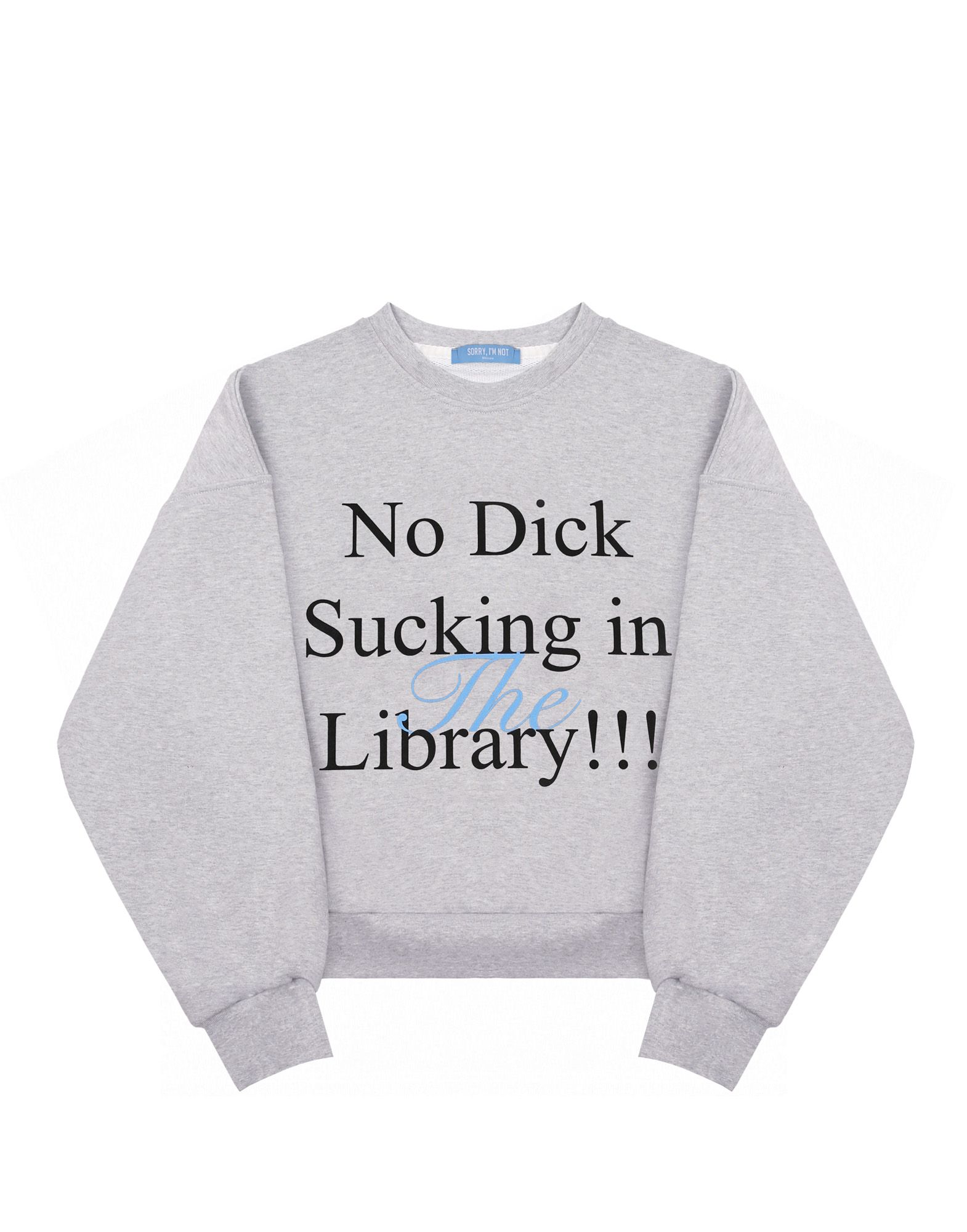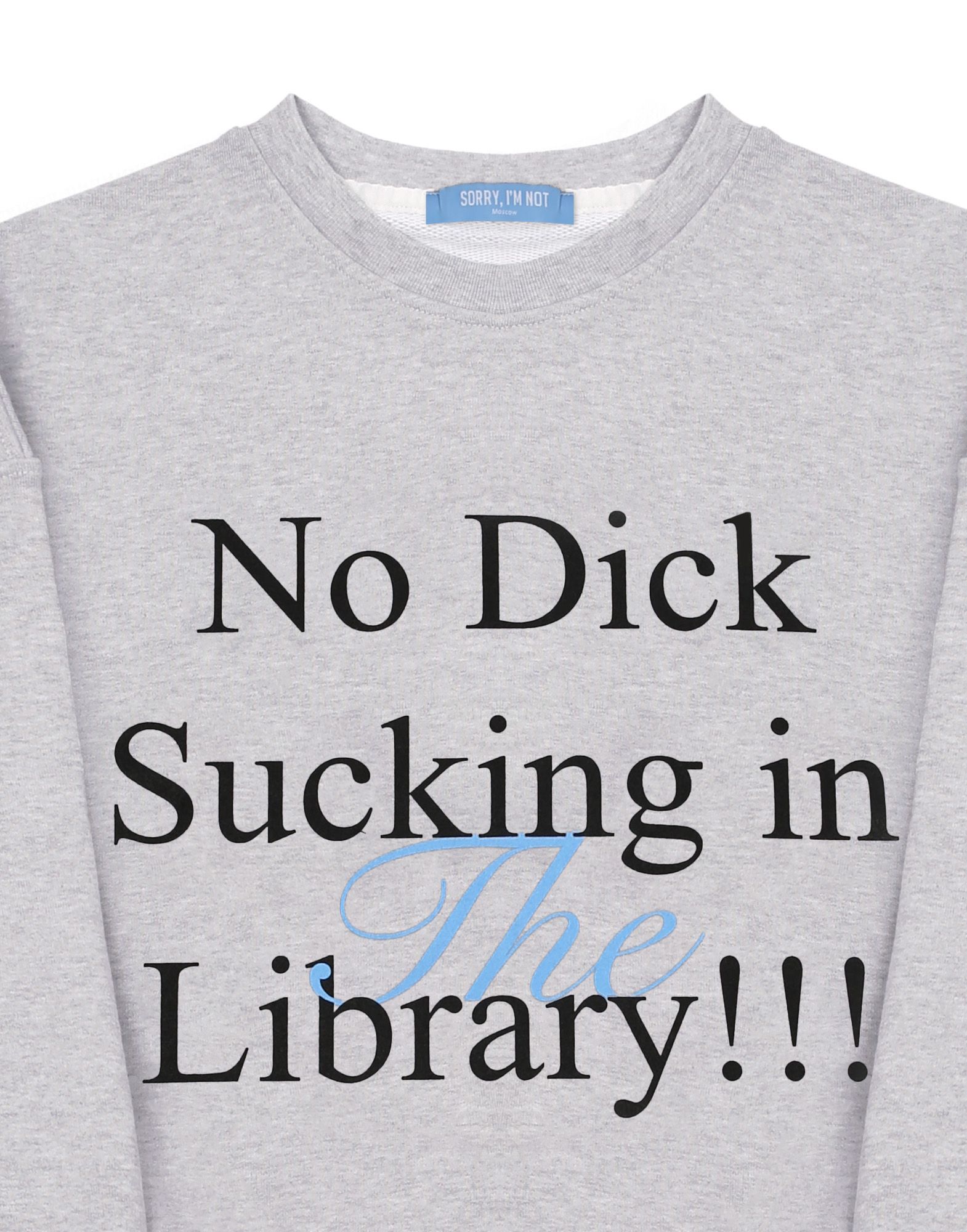 Свитшот цвета серый меланж из плотного хлопка, дополненный авторским принтом «NO DICK SUCKING IN THE LIBRARY». Свободный крой, спущенная линия плеч, изнанка выполнена из петельчатого футера.